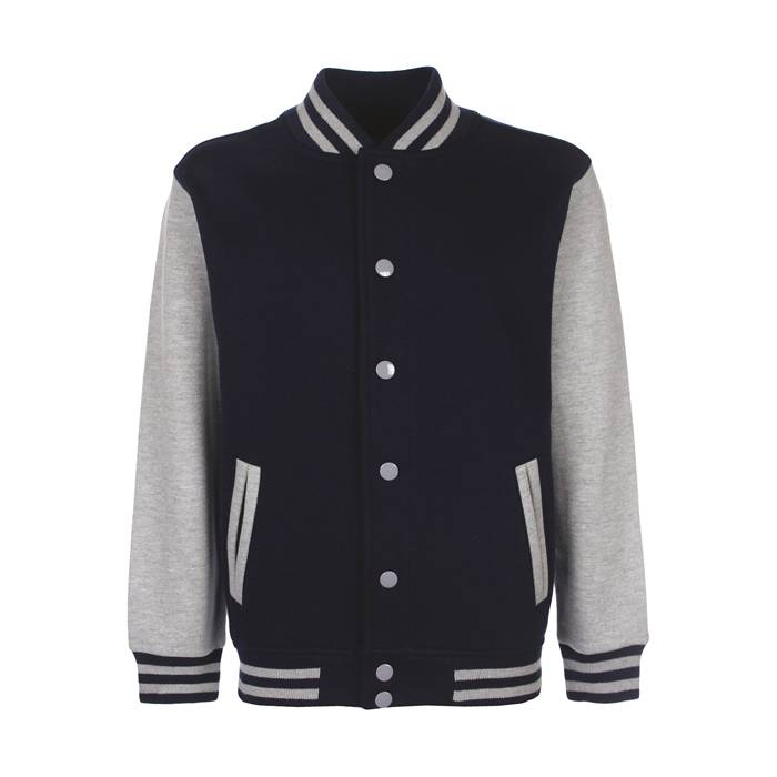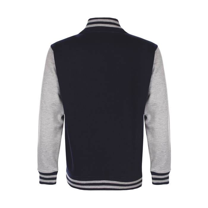 300 g/m2. 80% cotton, 20% polyester. Unisex style. Taped back neck. Contrast sleeves. Contrast press studs. Twin needle stitching. Contrast welted side pockets. Contrast striped welt and cuff rib.