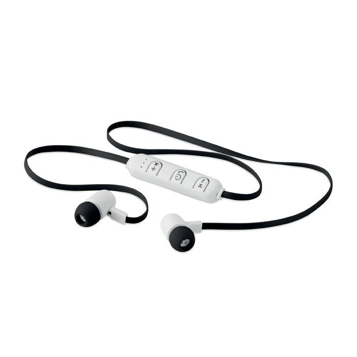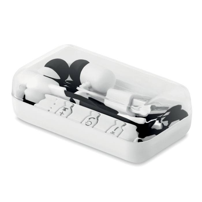 4.2 Bluetooth earphones with microphone. Rechargeable 55mAh Li-On battery. Presented in a plastic box. Playing time approx. 2 hours.