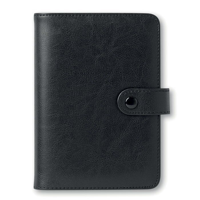 7 Multi-language organizer in black colour PVC, including compartments for cards and a pen holder.