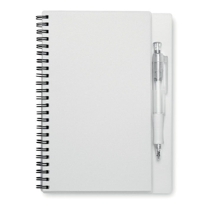 80 blank paged notebook A5 with push type pen. Black ink.