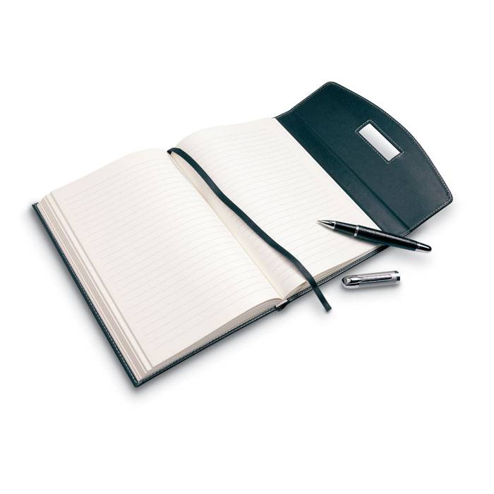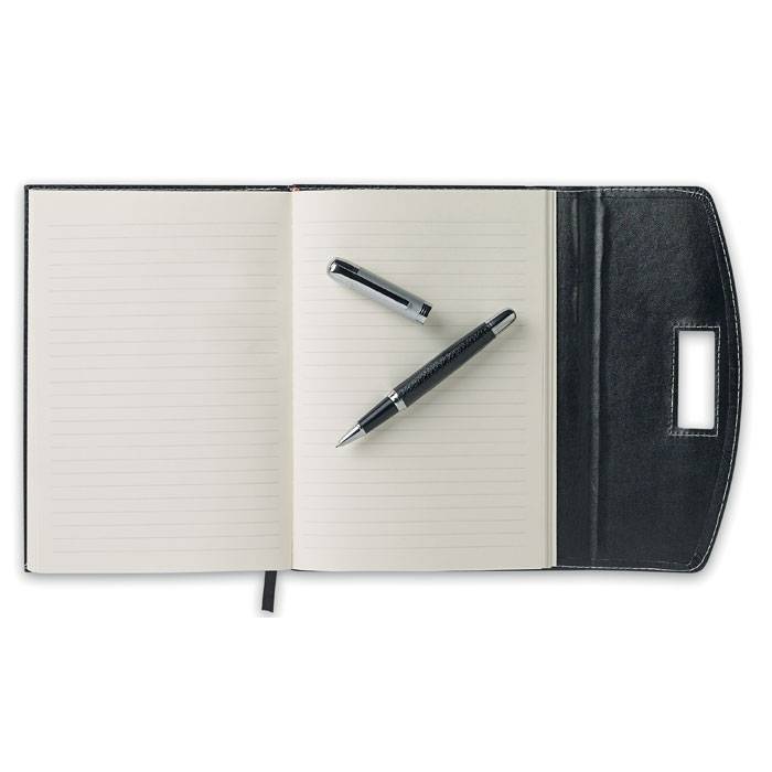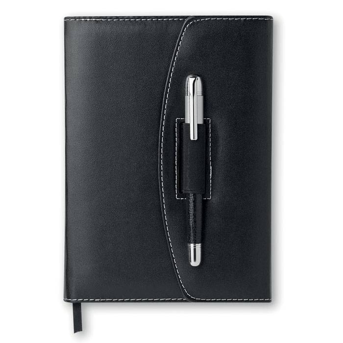 A5 size portfolio with contrasted stitching. Includes 120 page of lined paper and a metal pen. PU material. Black ink