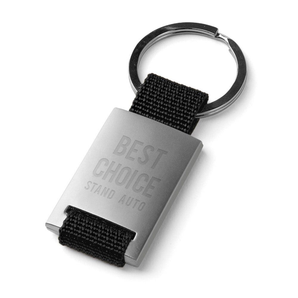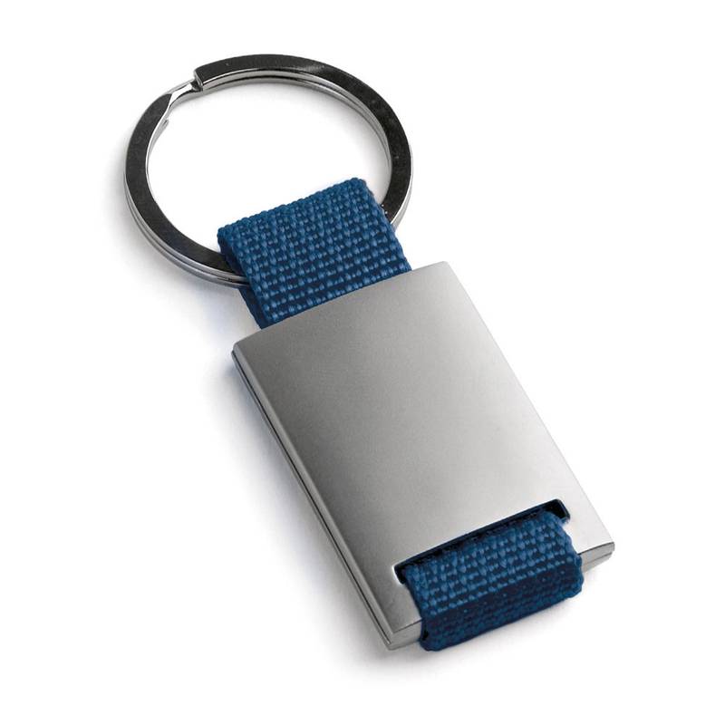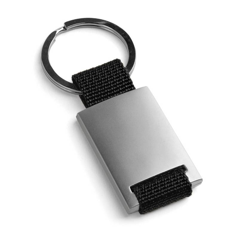 Metal and webbing keyring. This customisable keyring comes in a gift box. 28 x 60 x 6 mm