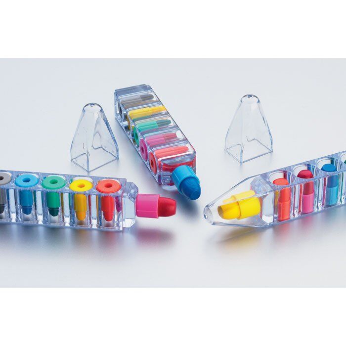 Set of 6 wax crayons in clear pen shape container.
