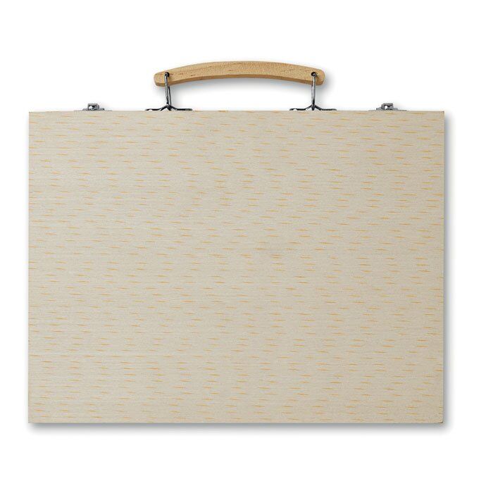 Artist’s set in wooden box including 66 pieces (wax crayons, oil pastels, markers, coloured pencils, water colours, sharpener, glue, eraser, paint brush, ruler, and pencil).