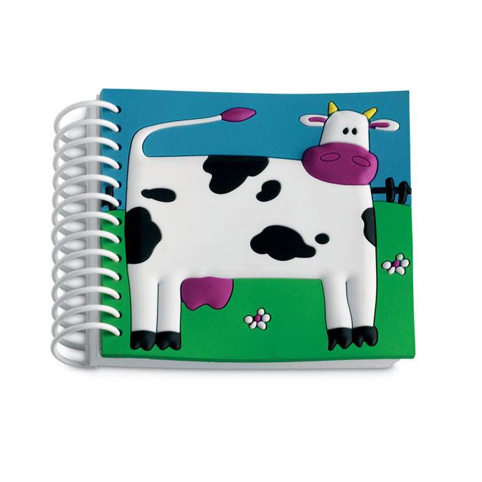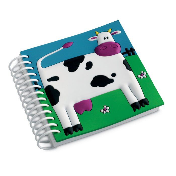 Soft PVC cover with white paper notebook with funny animals decoration and spiral binding.