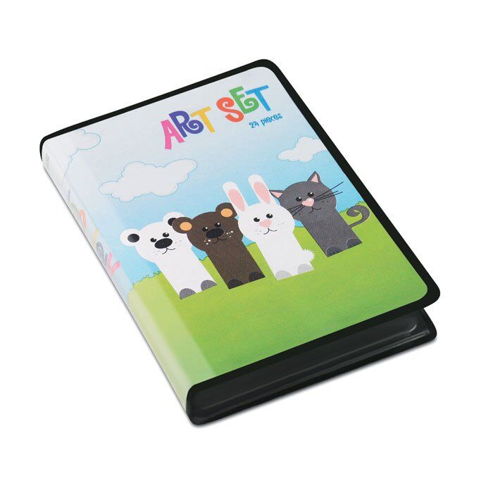Compact artist set for children in PVC plastic, including 24 essential pcs for drawing and painting.