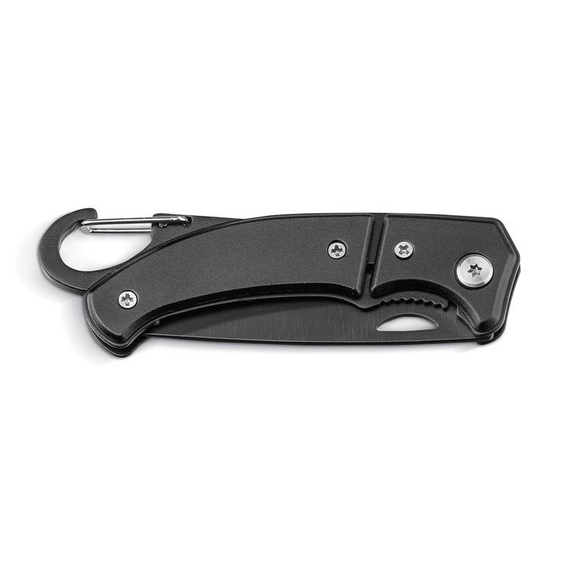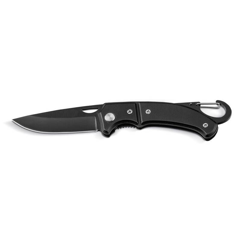 Pocket knife with safety lock and carabiner in stainless steel and metal. This product is supplied in a box. 101 x 10 x 29 mm | Box: 108 x 39 x 15 mm
