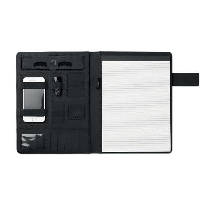 A4 portfolio in linen PU with magnetic closure including power bank with 4000 mAh capacity. Includes a built in micro USB to a Type C connector. Includes 20 page memo pad and several internal pockets