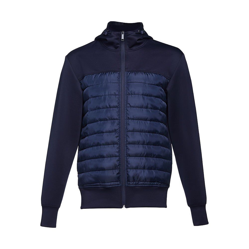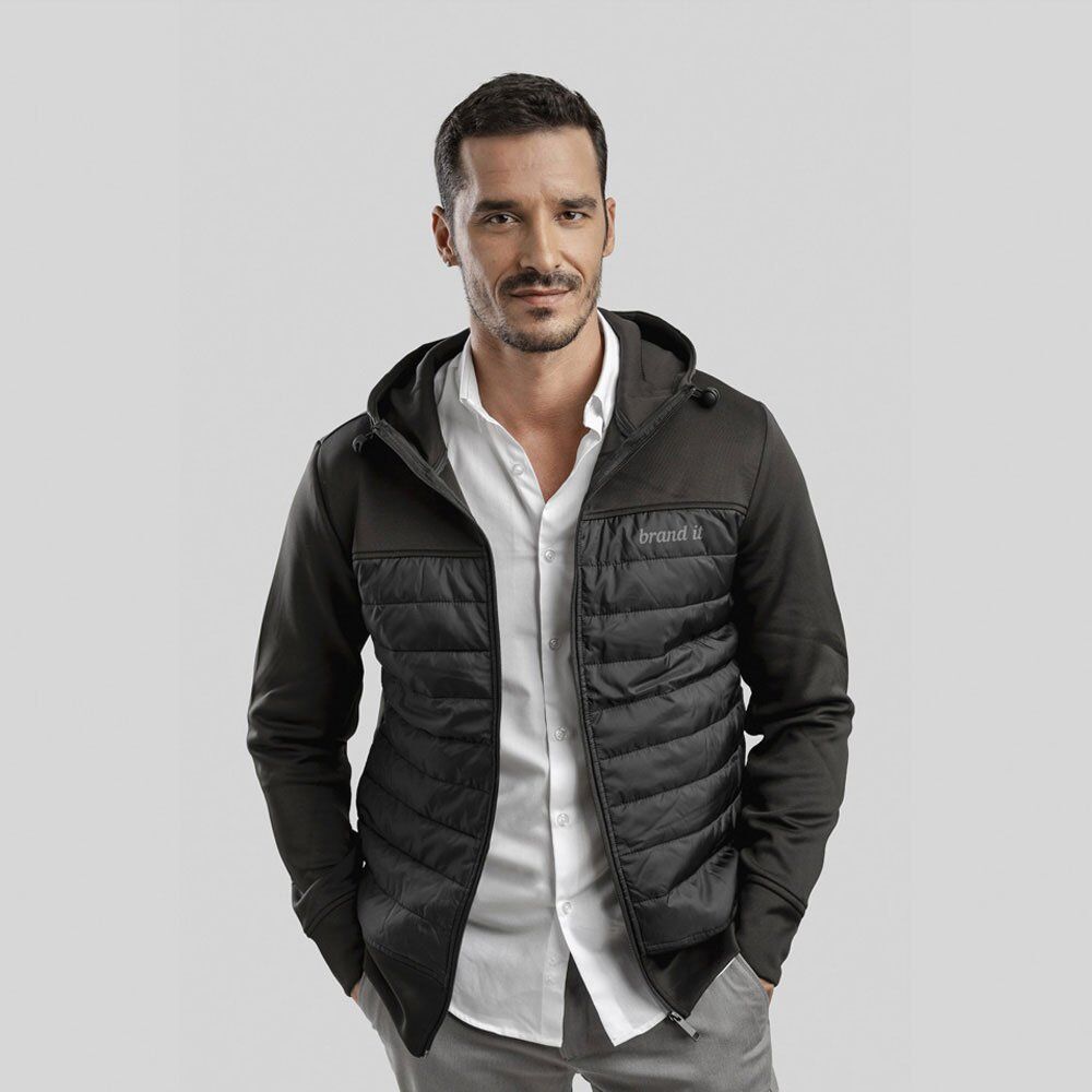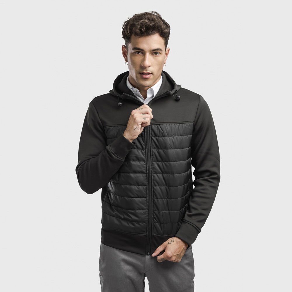 Men’s hooded jacket. Polyester 300T (95% polyester and 5% spandex): 150 g/m². Hood with stoppers. Interior pockets. Area above the chest for easy customisation. Sizes: S, M, L, XL, XXL
