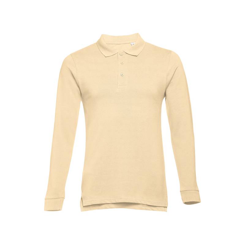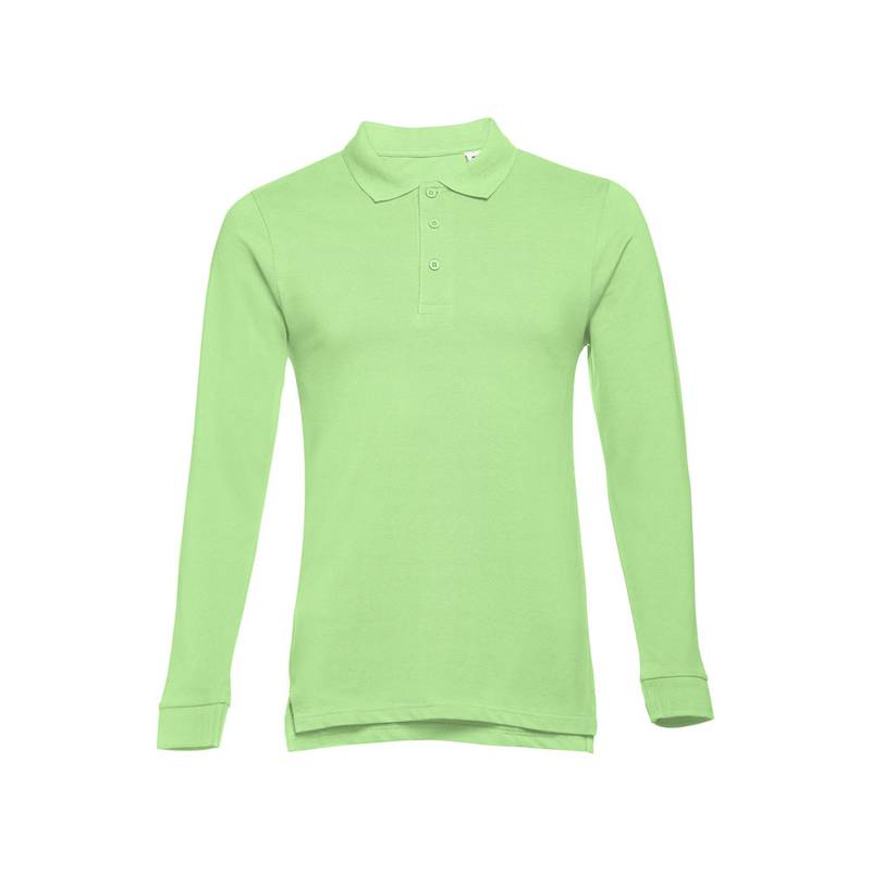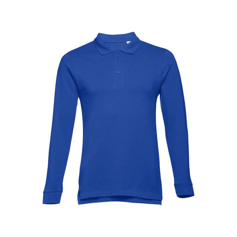 100% cotton pique men’s long-sleeved polo (210 g/m²). Colour 83: 85% cotton / 15% viscose. Rib collar and cuffs, rib reinforcement on collar and placket reinforced with 3 coloured buttons. Bottom with side openings. Substitute button on inner seam. Cut and sewn. Sizes: S, M, L, XL, XXL