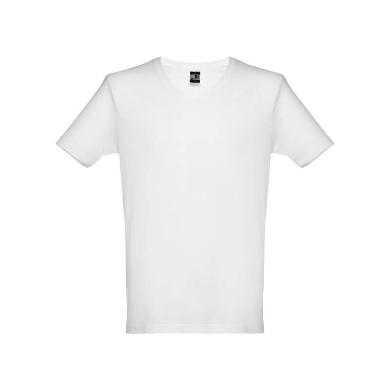100% cotton jersey men’s t-shirt (150 g/m²) with tubular shape. Short sleeve. V-neckline. Reinforcement tape. Collar in jersey. Double stitching on sleeves and bottom. Sizes: S, M, L, XL, XXL
