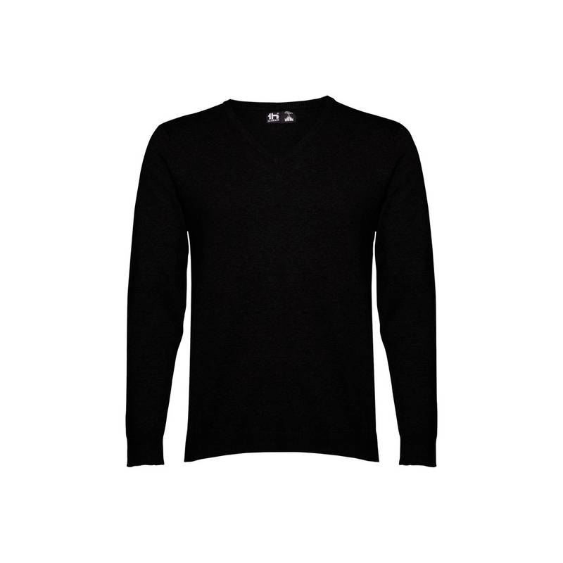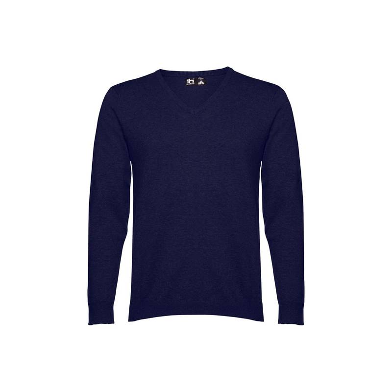Men’s V-neck pullover in 70% cotton and 30% polyamide (220 g/m²). Rib cuffs and bottom. Sleeves inserted with fully-fashion. Sizes: S, M, L, XL, XXL