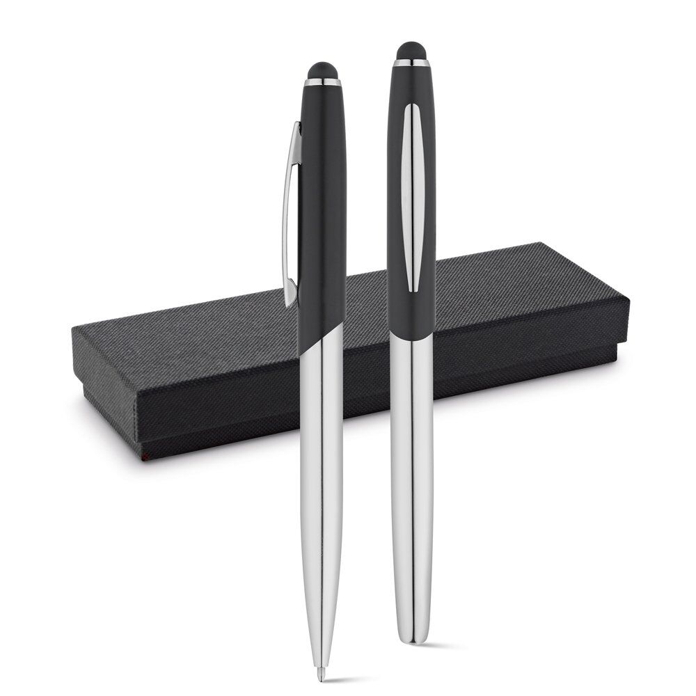 Metal ball pen and roller set. Both products have touch tips. The set is supplied in a padded gift box. ø10 x 133 mm | Case: 175 x 55 x 25 mm