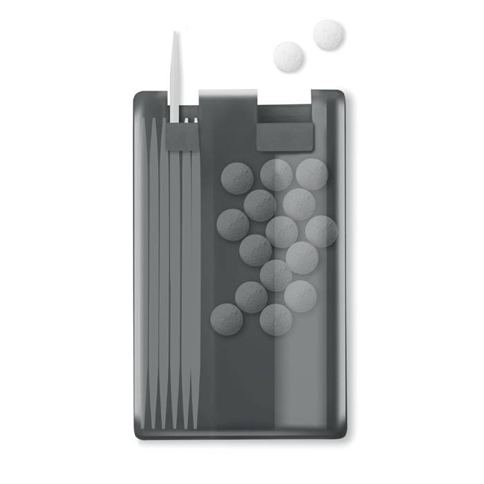 Credit card mint dispenser with 7 toothpicks and 30 mints approx. 4 grams.