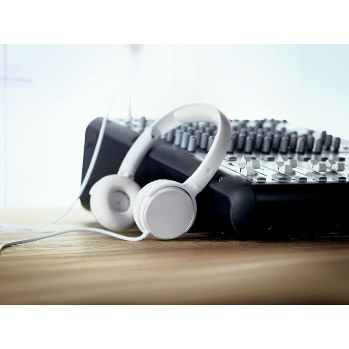 Headphones in shiny ABS casing. Has a transparent adjustable top on the outside for round paper insert. 120 cm length cable