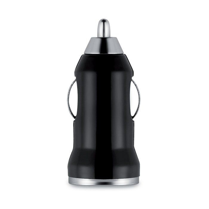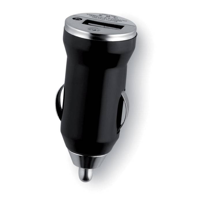 USB car charger in ABS and aluminium alloy with red light charger indicator. Delivered in silver carton box