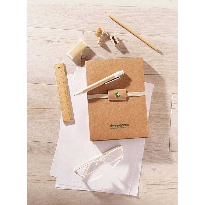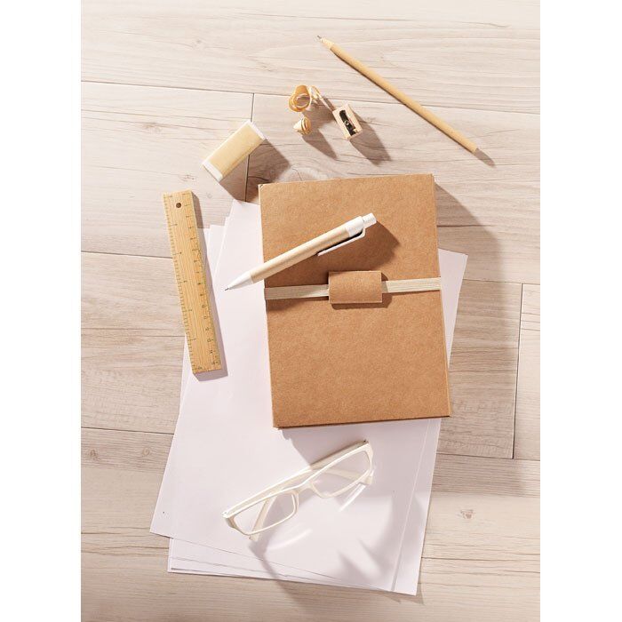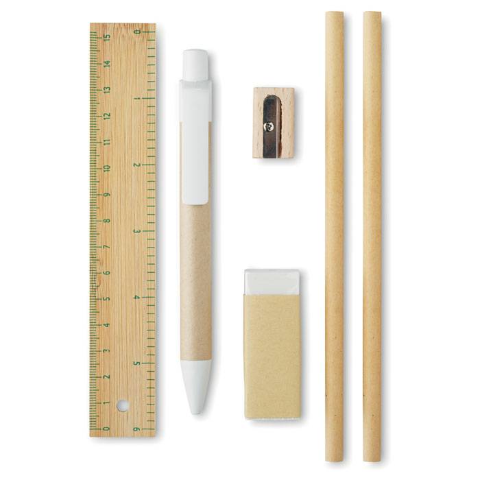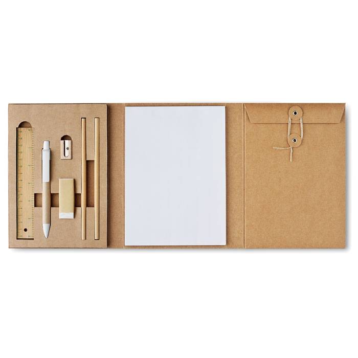 Stationery set with 8 pieces in folder. Including paper memo pad, 2 unsharpened pencils, ruler, sharpener, eraser and blue ink pen. Also has an envelope pocket. 40sheet.