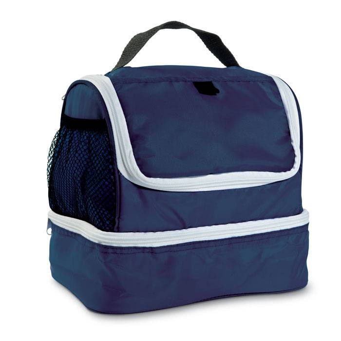 Cooler bag 210D polyester with 2 compartments and with mesh pocket on the side.
