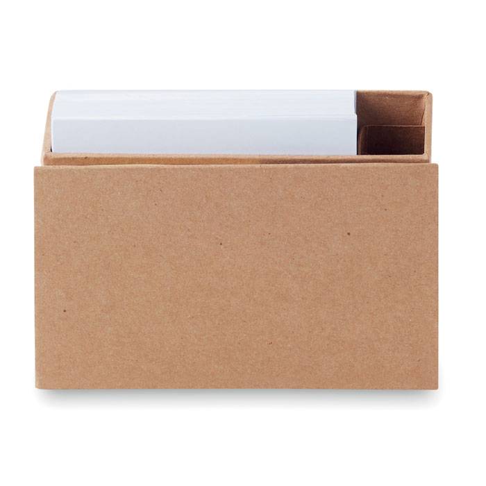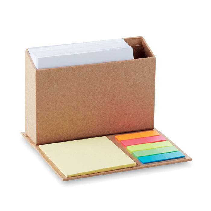 Foldable memo pad holder with sticky notes and pen holder on the side.