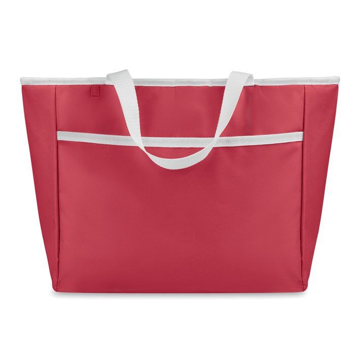 Cooler or shopping bag in 600D polyester with 1 main compartment and front pocket. Short handles.