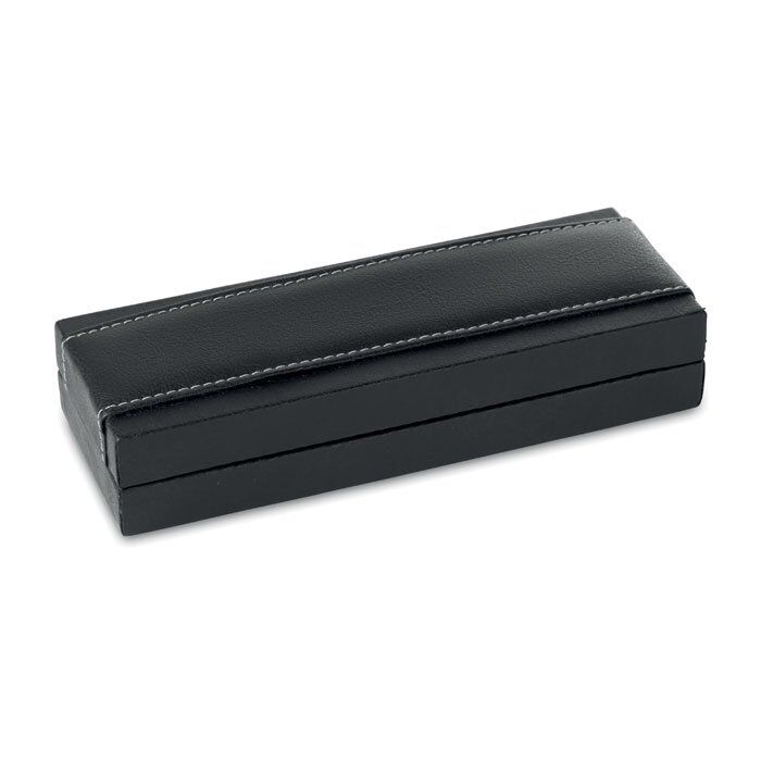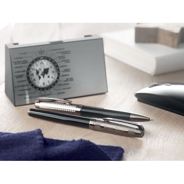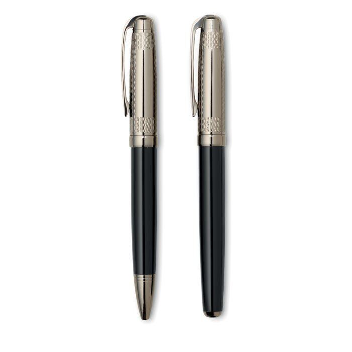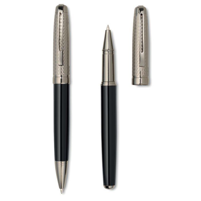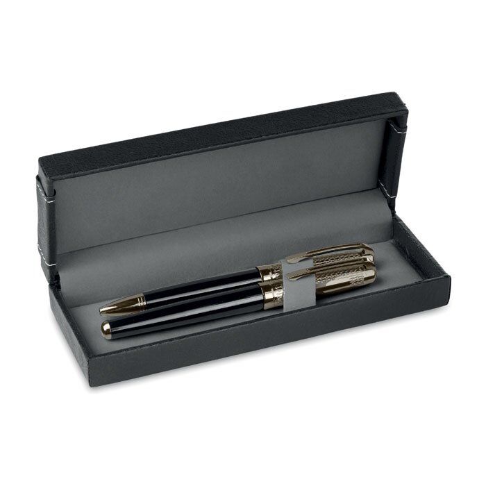 Metal pen set with ball pen and roller. Cap is in brass. Blue and black ink respectively. Presented in PU box.
