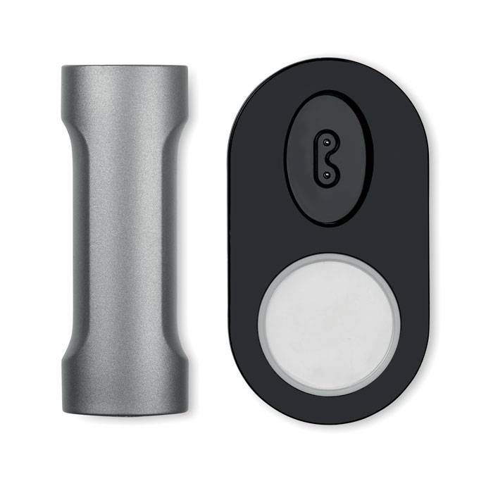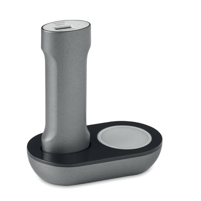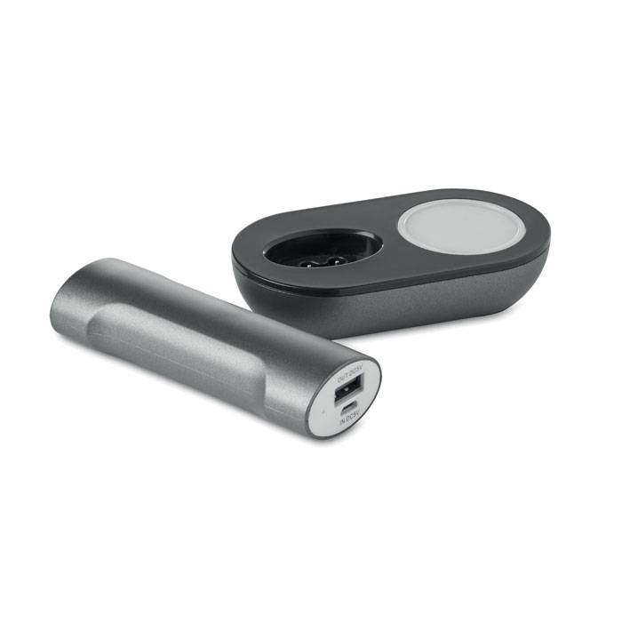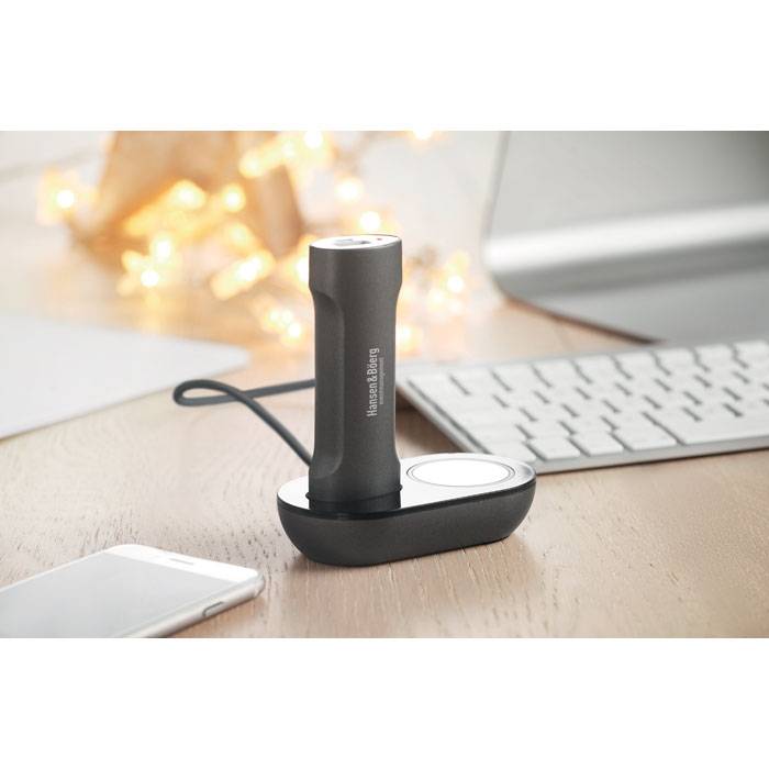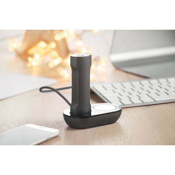 Power bank 2200 mAh in ABS. It comes with a charging base with 2 hubs and light. Capacity for smartphone use, out put current DC5V/1A. Includes indicating light and USB cable with micro usb plug.
