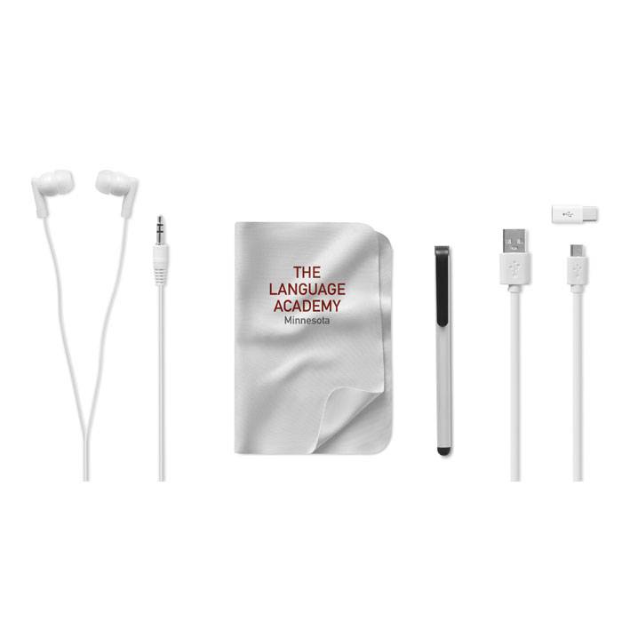 Phone travel set including earphones, USB line, touch pen, microfiber cloth, speed 2.0 type C connector.