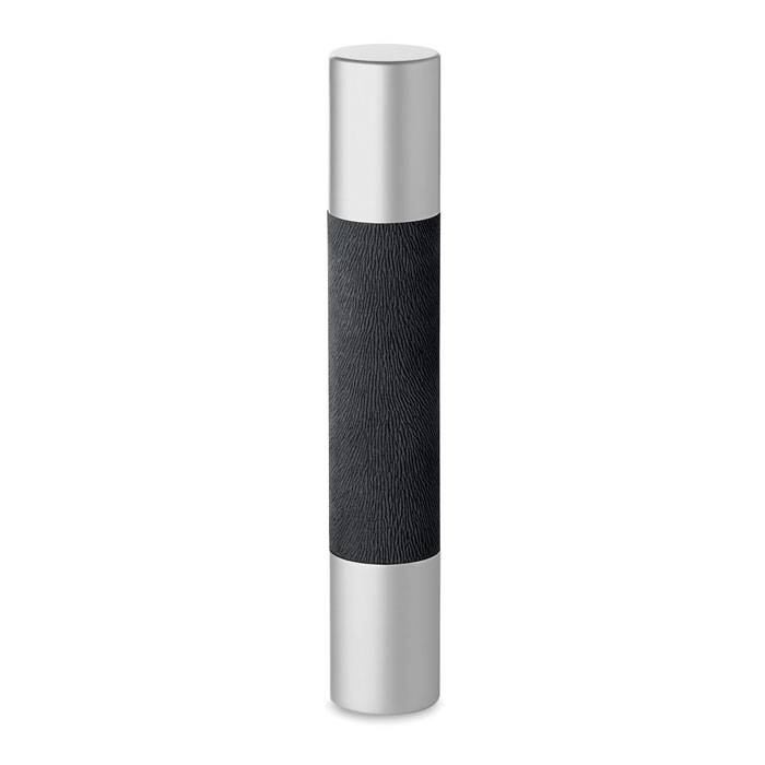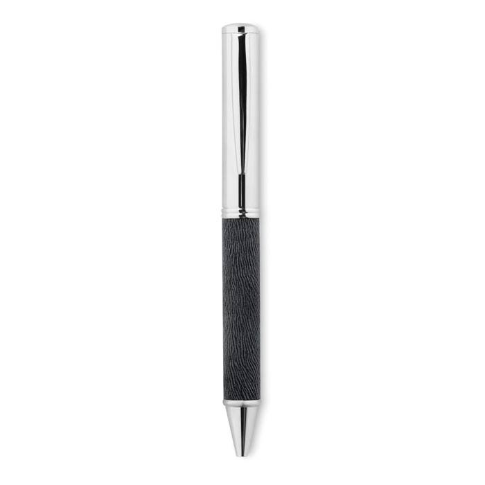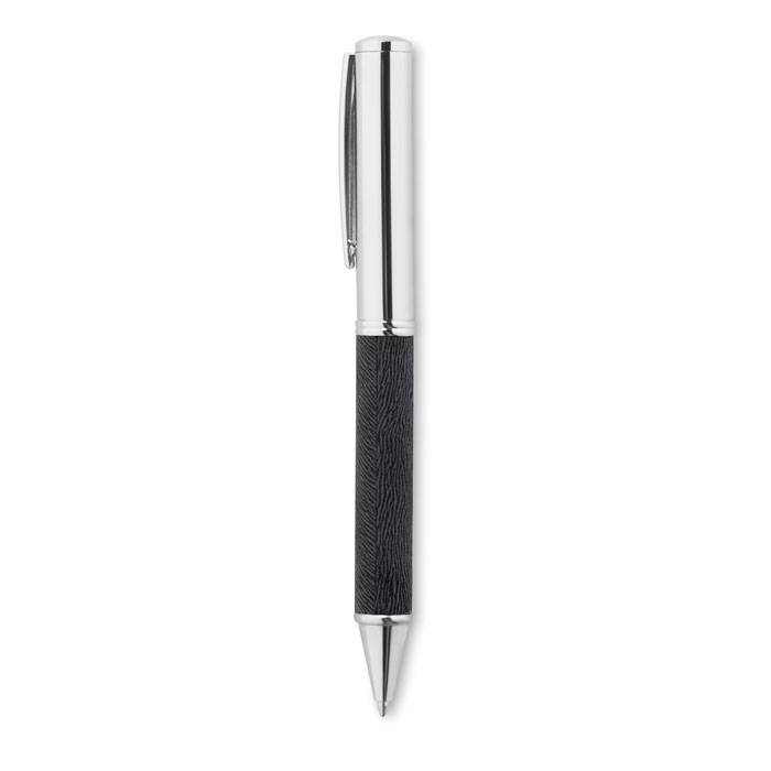 Metal twist ball pen with silver chrome finish and PU detail. Combined in matching aluminium tube box. Blue Ink.