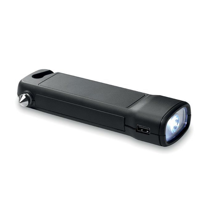 Car power bank 4400 mAh with torch, belt cutter and hammer. Output data: DC5V/1A. Includes a type C connector.