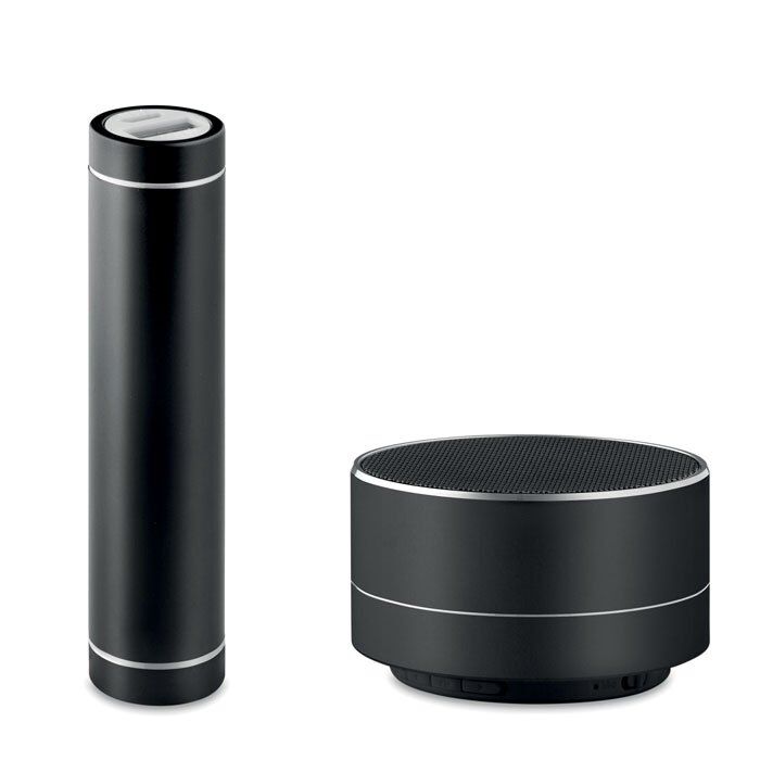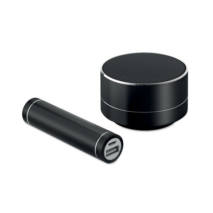 Gift set including Power Bank 2200 mAh and aluminium 4.2+BR+EDR Bluetooth 3W speaker with rechargeable Li-ion 450 mAh battery. With micro USB charging cable and Type C connector included.