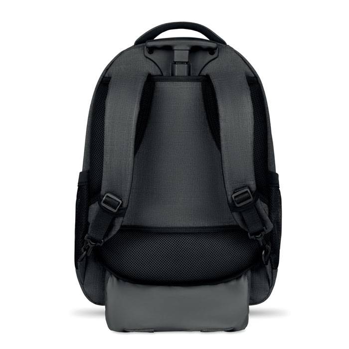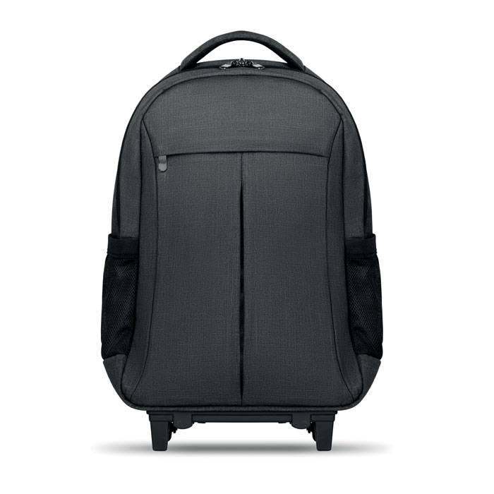 Backpack trolley in 360D 2 tone polyester. Includes one internal 15 inch laptop compartment and one main front part with zipper pocket. Padded back and shoulder straps. Includes Tablet compartment. Has an integrated sleeve for protecting the wheels when carrying.