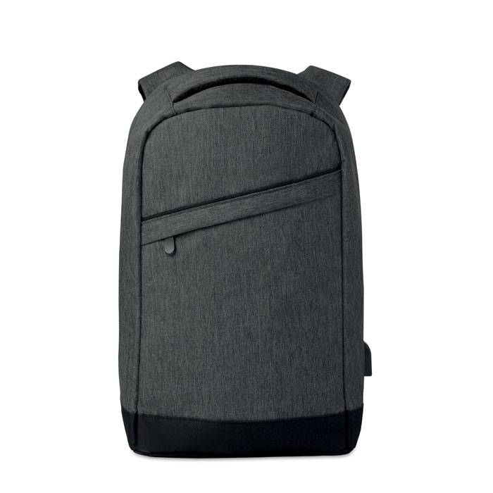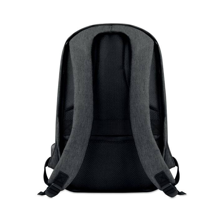 600D 2 tone polyester backpack with padded shoulder strap with main internal compartment. Includes one internal 13 inch laptop compartment and an USB charging cable. Zipper main compartment on backside for better protection.