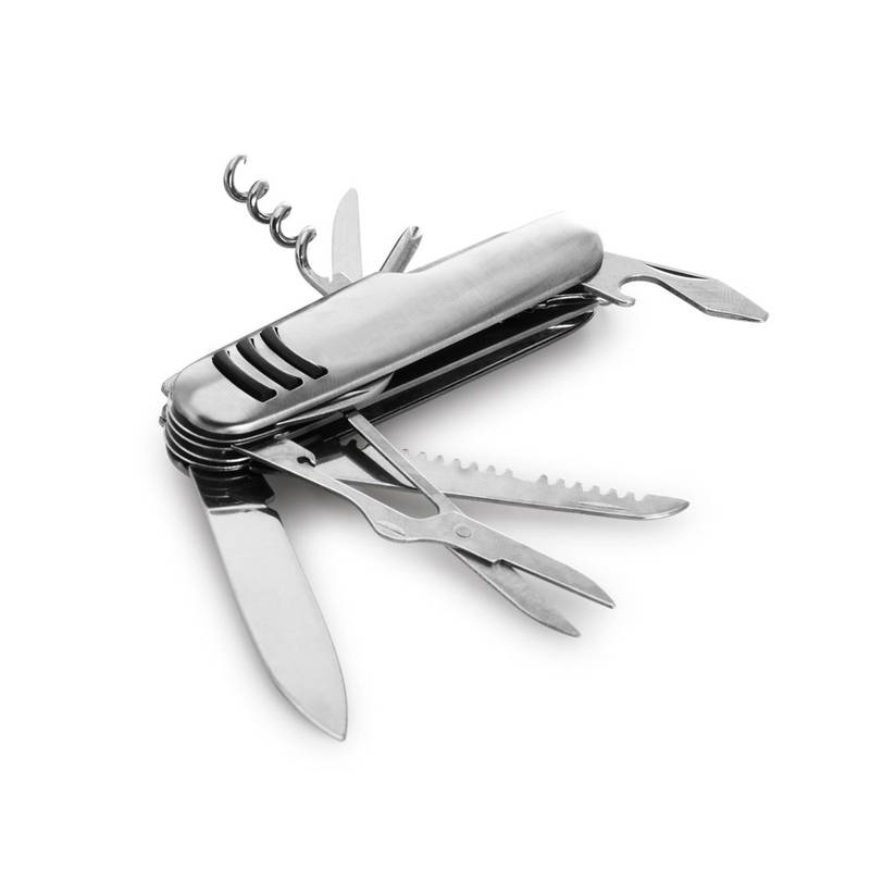 Outdoor kit in stainless steel, metal and aluminum. This kit had a multifunction pocket knife with 11 functions and flashlight (includes 3 AAA batteries). Supplied in a 600D pouch. Pouch: 84 x 120 x 25 mm