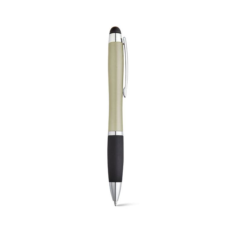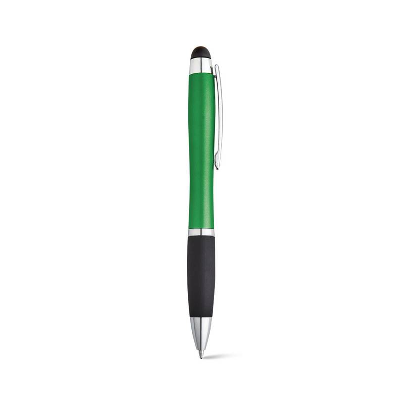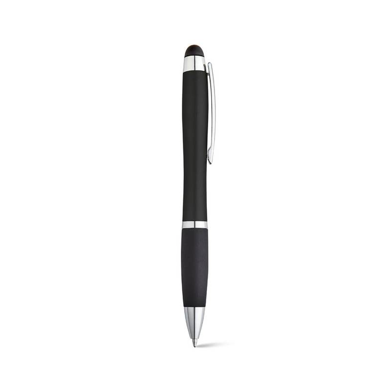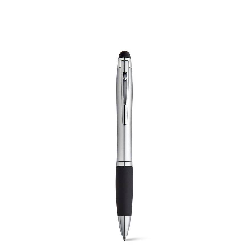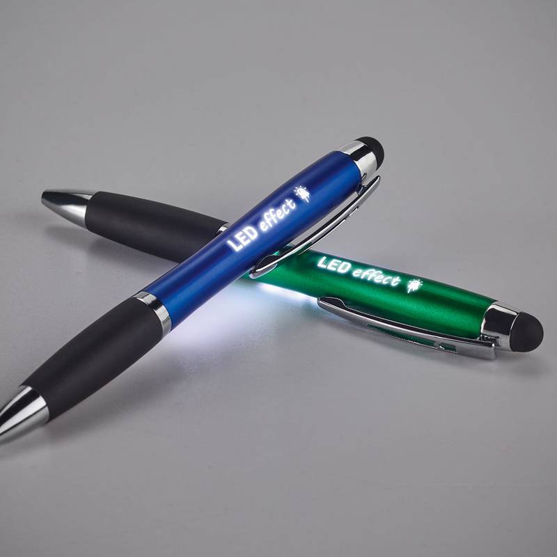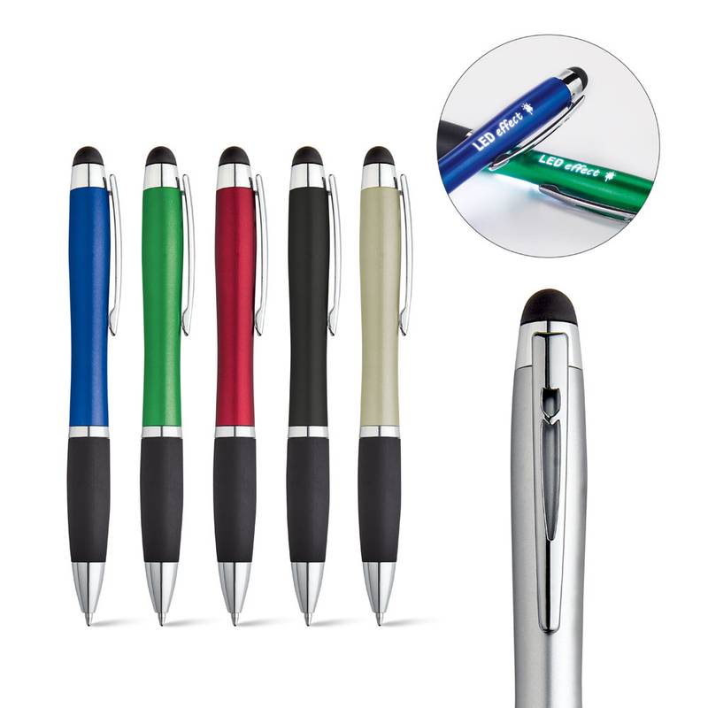 Ball pen with light inside and with a metal clip, a non-slip surface and a touch tip. Includes 3 AG3 batteries. ø11 x 135 mm