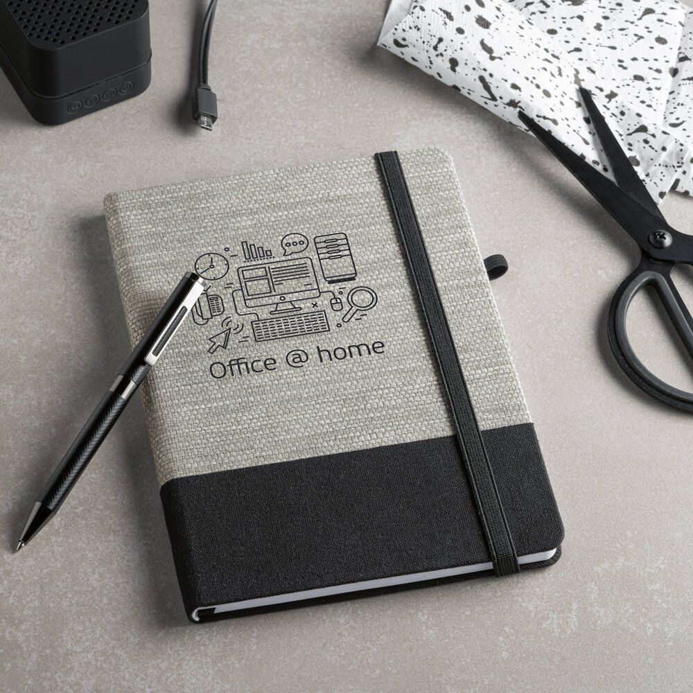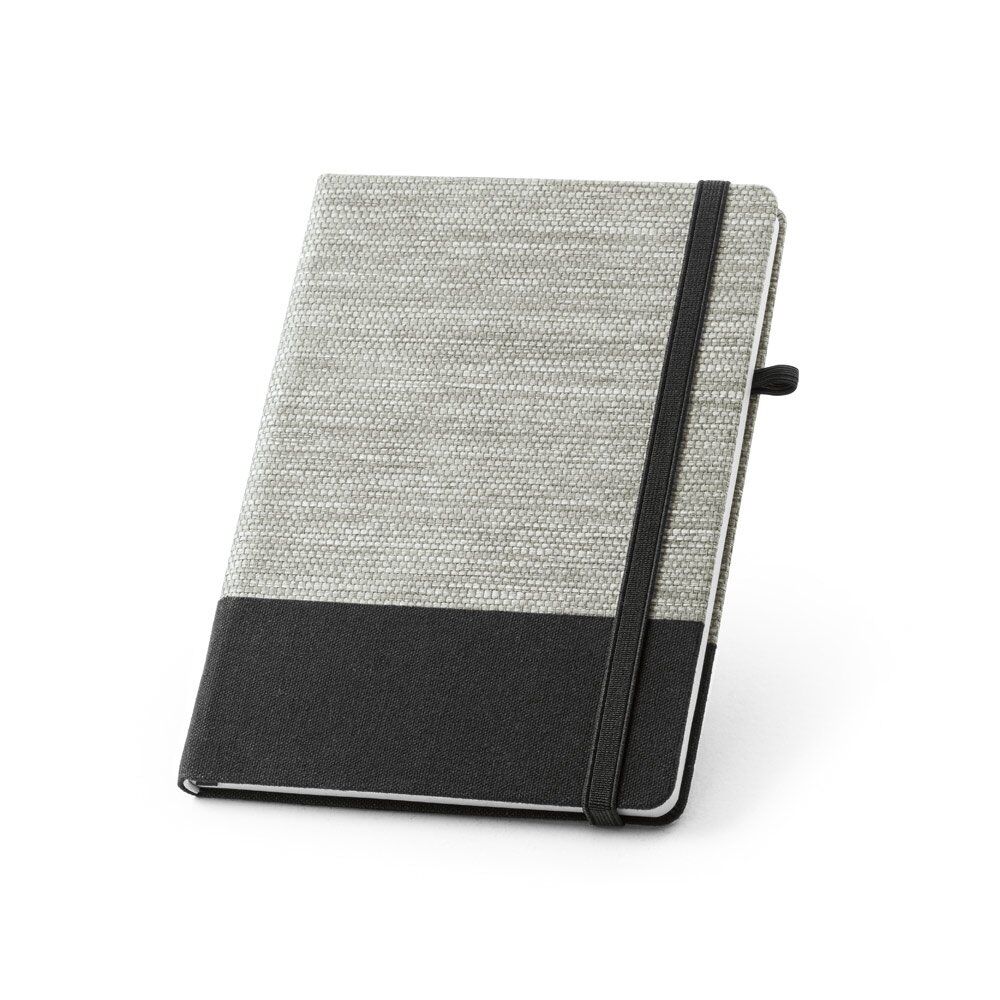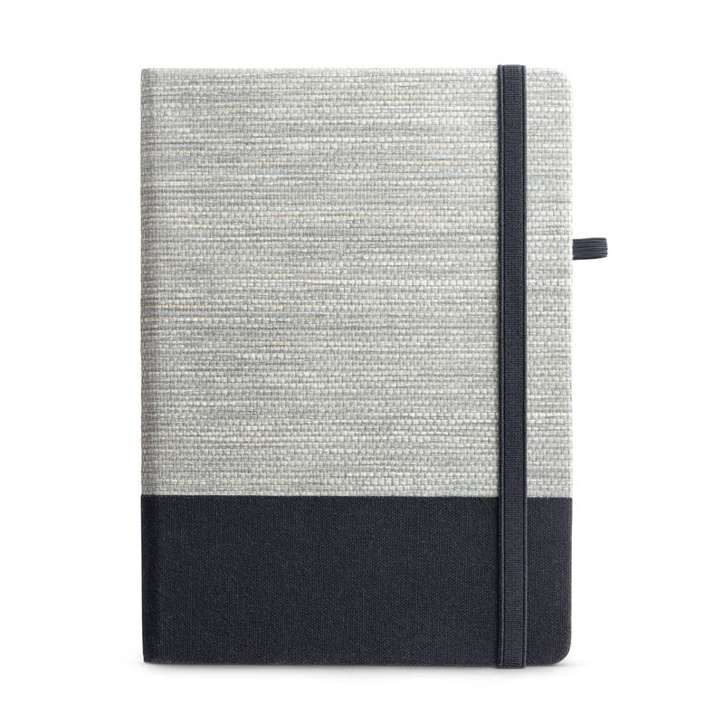A5 notepad with hardcover and rounded corners made from natural straw fibers and cotton canvas. This notepad has 192 lined white pages, bookmark ribbon, elastic band, and pen holder (pen not included). 150 x 210 mm