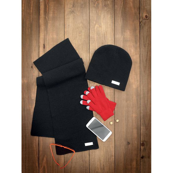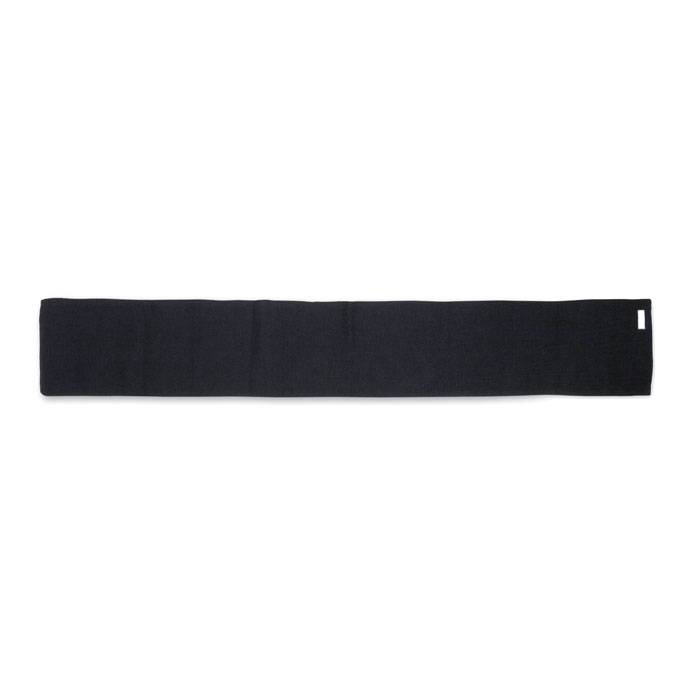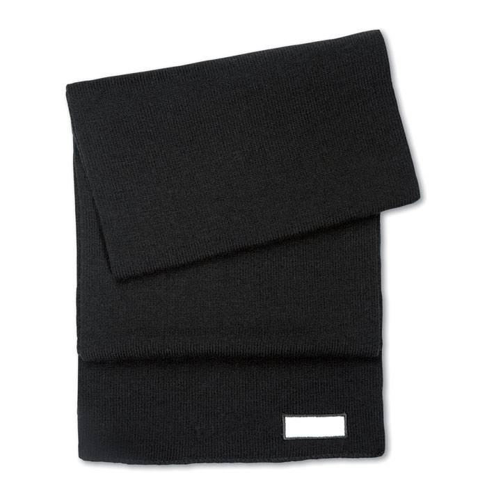 Acrylic knitted scarf with embroidered label on side with matching colour stitching.