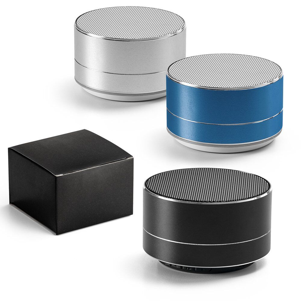 Aluminum speaker with microphone, bluetooth transmission and TF card reader, 3W/4 power and autonomy up to 5h. Functions: answering calls, volume control, connection to mobile device’s playlist and FM radio. This product includes micro USB cable for charging and is supplied in a gift box. ø71 x 42 mm | Box: 80 x 80 x 60 mm