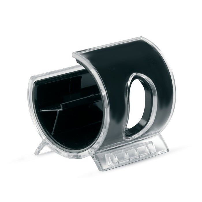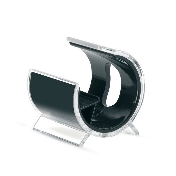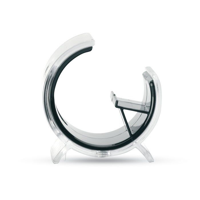 Mobile phone stand in plastic covered by transparent plastic layer.