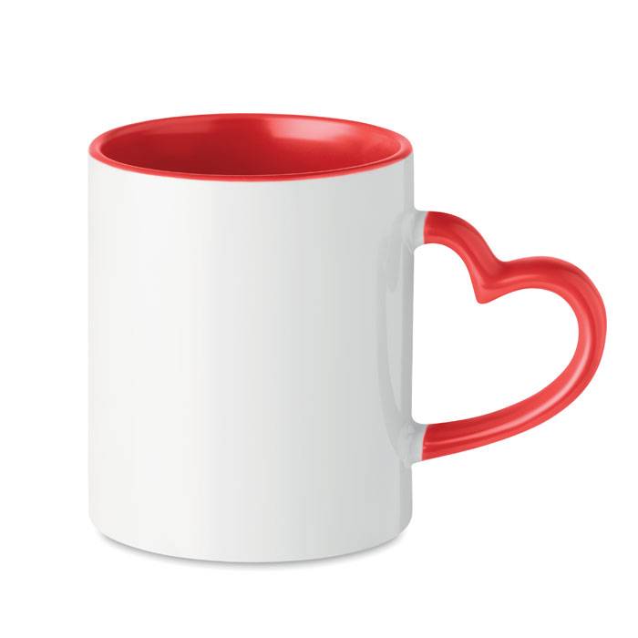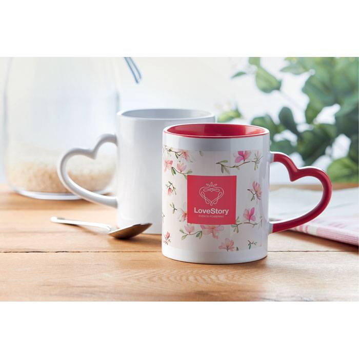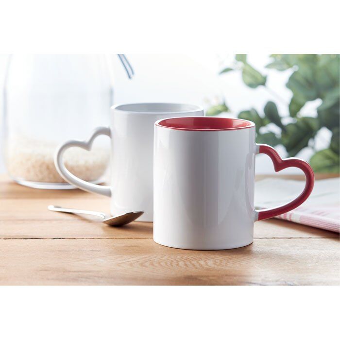 Ceramic mug 300 ml capacity with heart shaped handle and special coating for sublimation. Individual packing in white carton box.