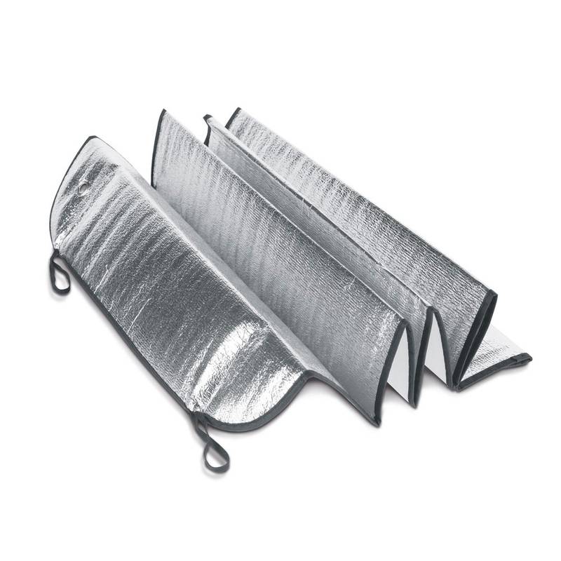 PE foam car sunshade lined and with 1 aluminum foil. This sunshade is suitable for front glass and includes 2 suction cups. 1300 x 600 mm