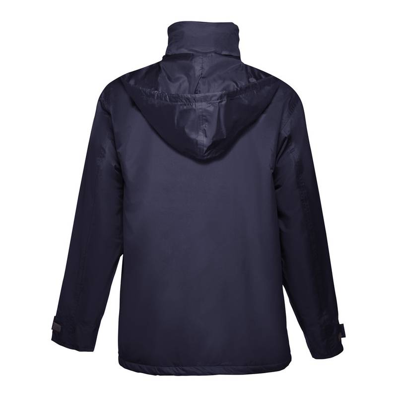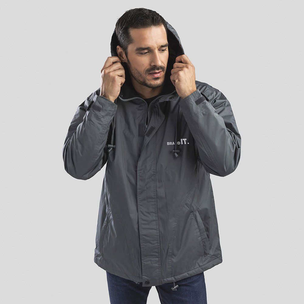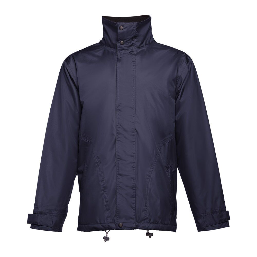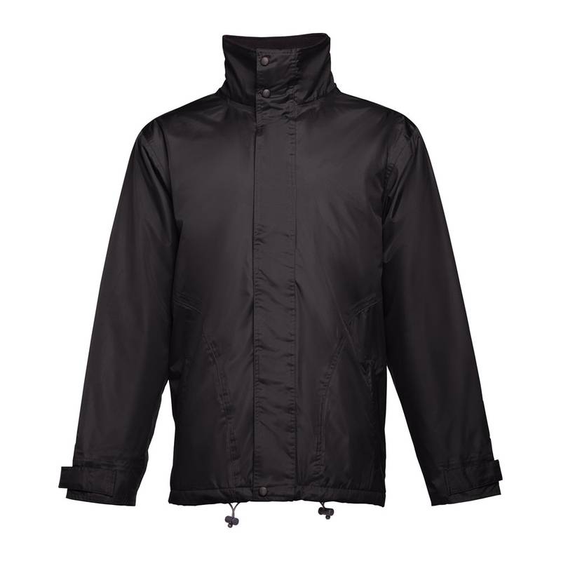 Padded unisex parka. 100% polyester pongee 240 exterior and waterproof PVC coating. 100% polyester taffeta interior. Filling: polyester (80 g/m²). Collar lined in black polar mesh (closes with velcro strap). Foldable hood on the collar, adjustable via black stoppers. Flap opening, coloured zipper, velcro and black spring buttons. 2 outer pockets with flap and 2 inner pockets (1 for mobile phone) with velcro closure. 2×2 ribbed inner cuffs. Adjustable outer cuffs with velcro straps. Heat sealed seams. Zippered lower back access for easy customisation. Sizes: XS, S, M, L, XL, XXL