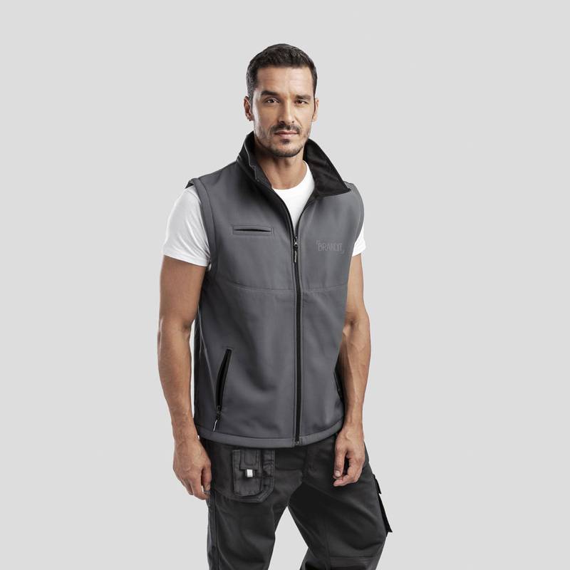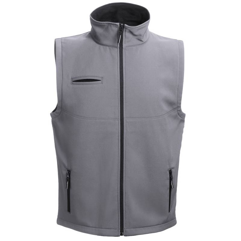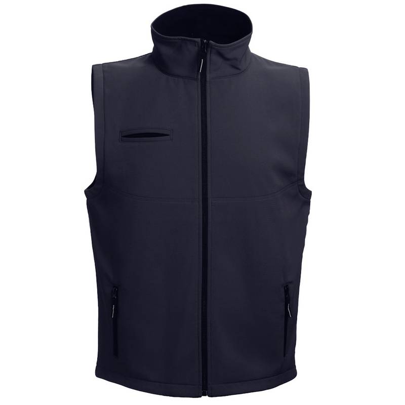 Unisex softshell vest. 96% polyester and 4% spandex (2 layers): 280 g/m². Windproof. Water repellent coating. 3 pockets: simple chest pocket and 2 zipped pockets. Lower back longer than the front. Easy access customisation area. Sizes: S, M, L, XL, XXL, 3XL