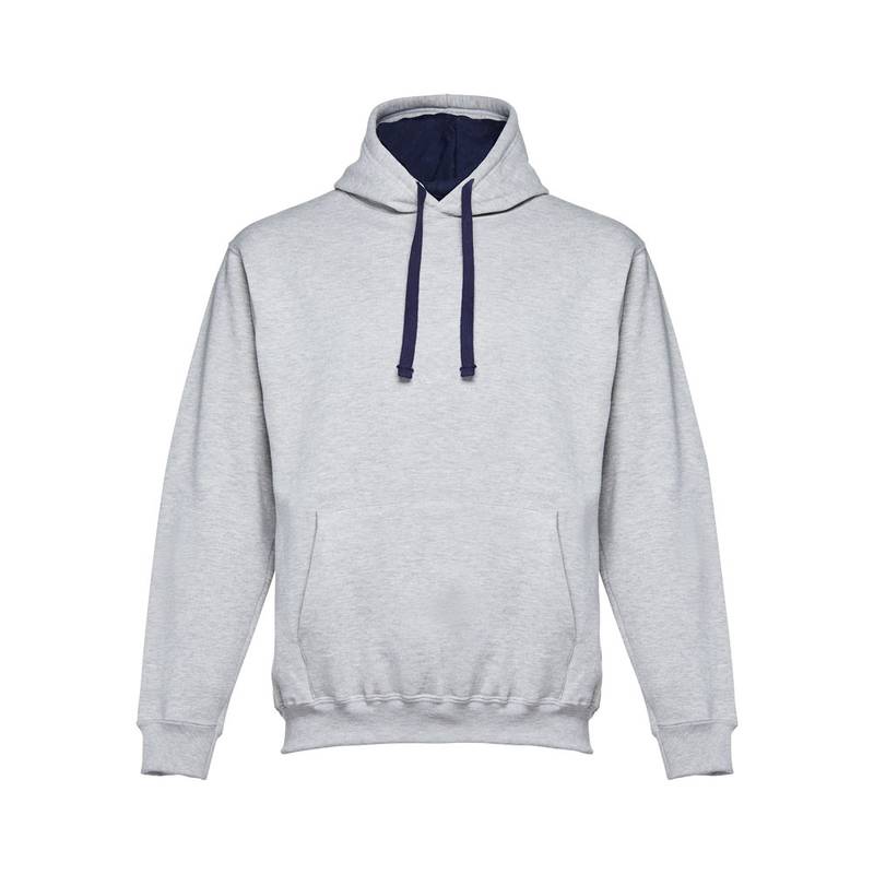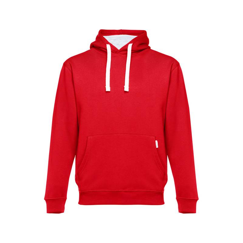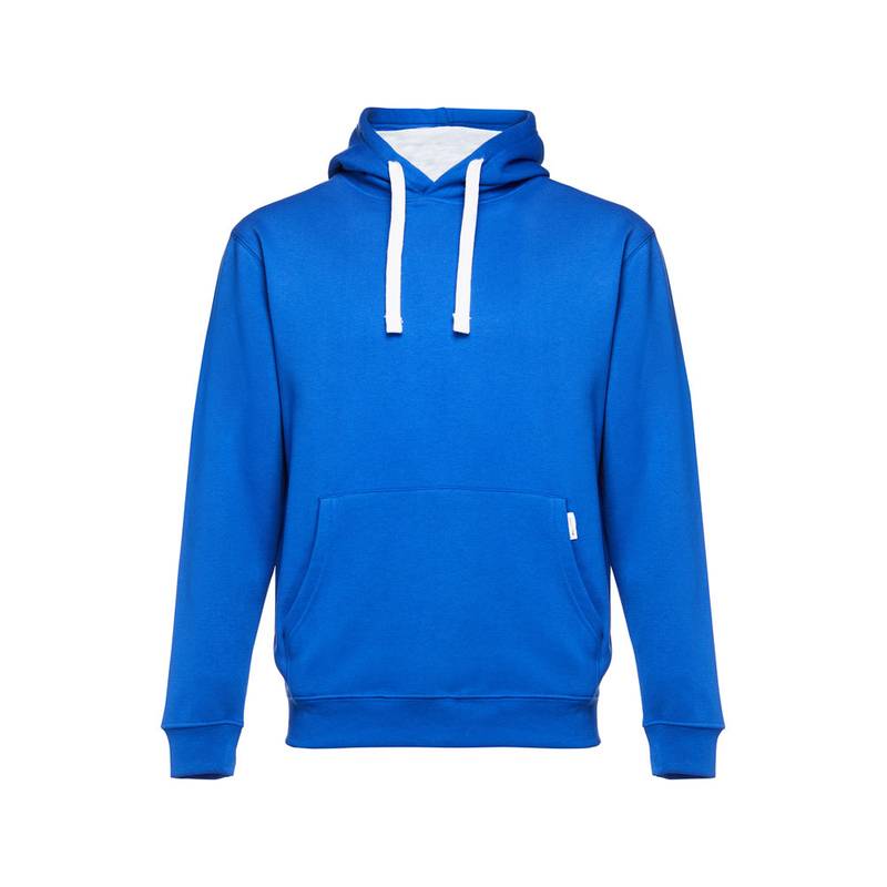 Unisex sweatshirt in 50% cotton and 50% polyester (320 g/m²). Carded interior. Rib 1×1 at the wrists and waistband. Marsupial pocket. Hood and drawstrings in contrast colour. Sizes: S, M, L, XL, XXL