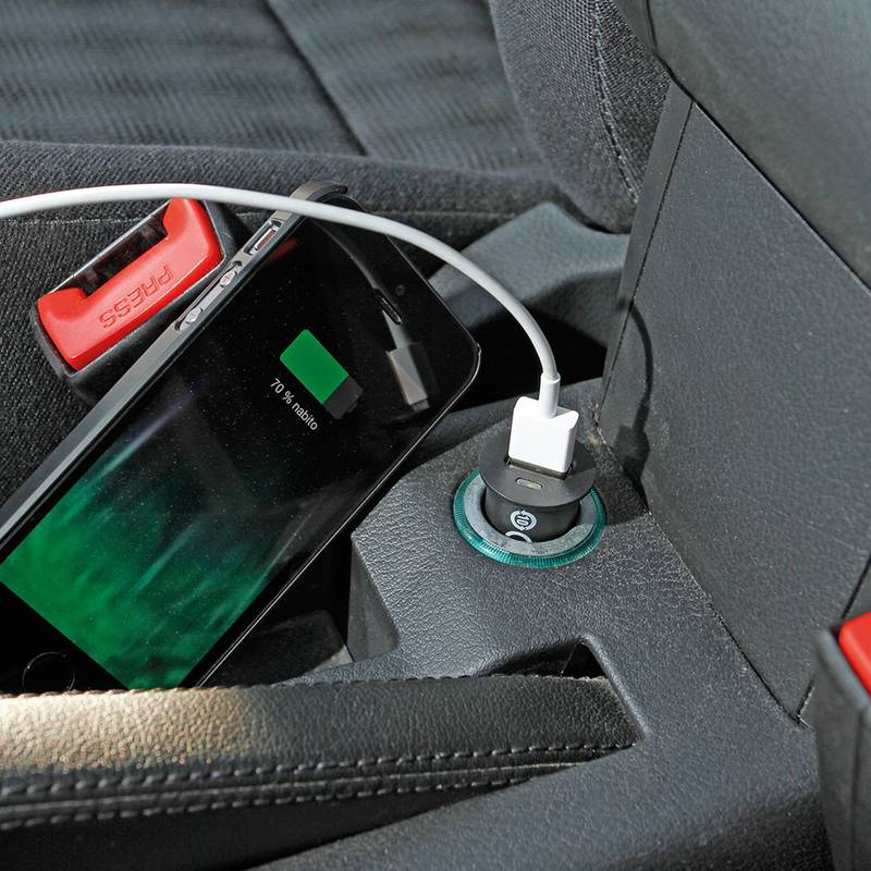 USB car adapter with 5V/1A output and 12-24V voltage input. This product is suitable for charging mobile phones. ø25 x 45 mm