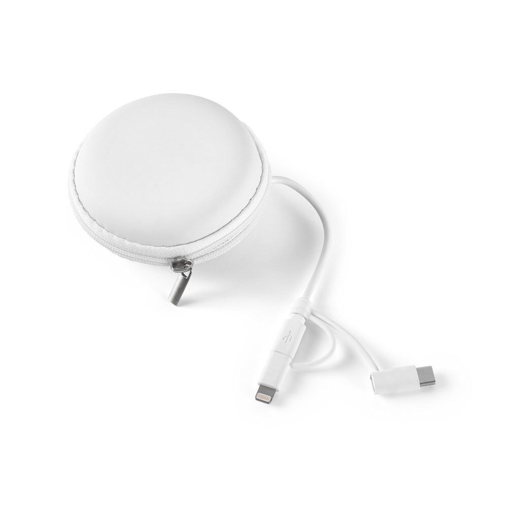 3-in-1 USB cable that is suitable for charging mobile devices. Features a micro USB connector and Lightning® (MFI certified) and Type C USB adapters. This product is supplied in an EVA pouch. Cable: 1020 mm | Pouch: ø75 x 36 mm