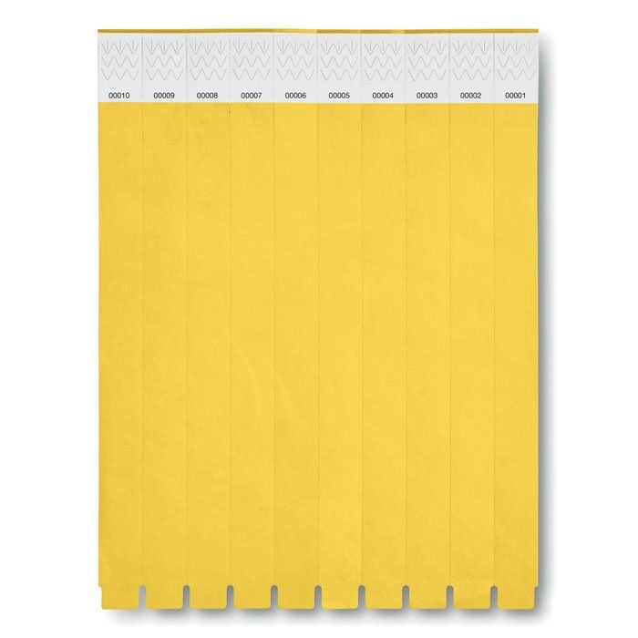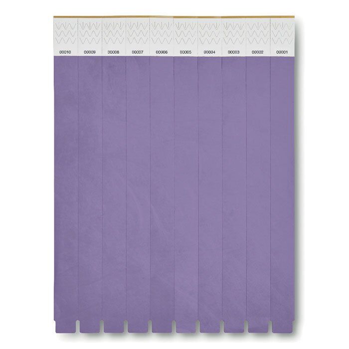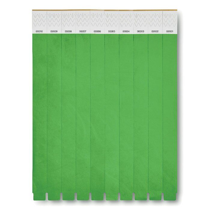 One sheet of 10 event wristbands. DuPont ™ Tyvek® 19mm wide. Including unique numbering on each wristband.