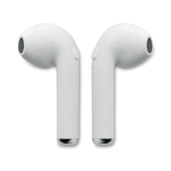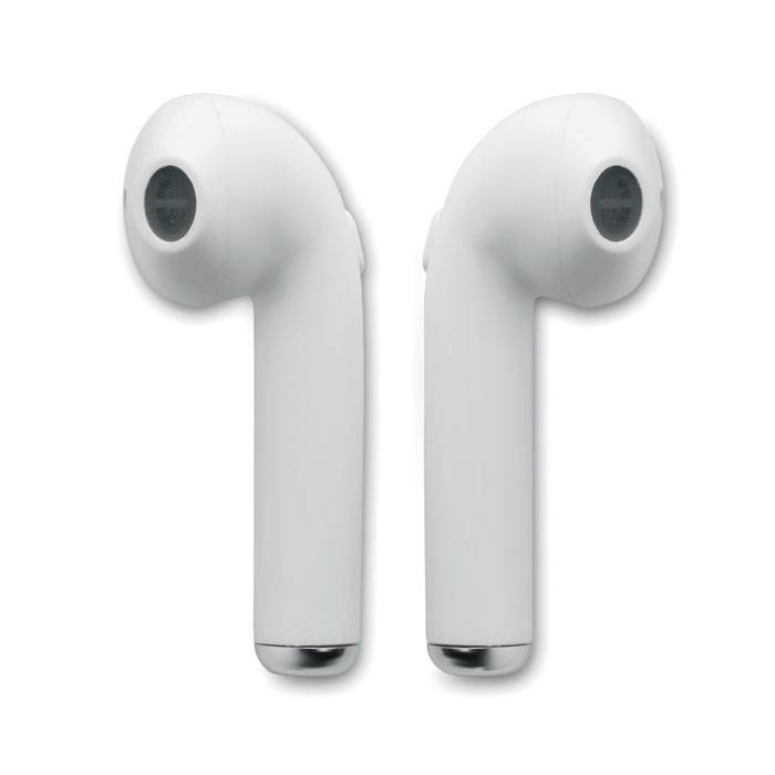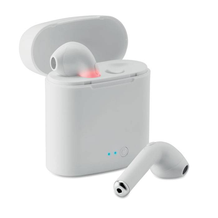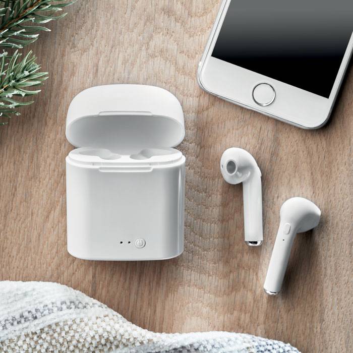 Set of 2 wireless 4.2 bluetooth stereo headphones with 35 mAh battery build-in. Playing time approx. 3 hours. Including a micro USB charging cable. Presented in box which also acts as a charging station with rechargeable Li-ion 400 mAh battery.