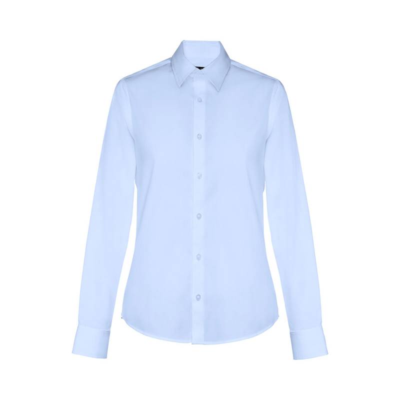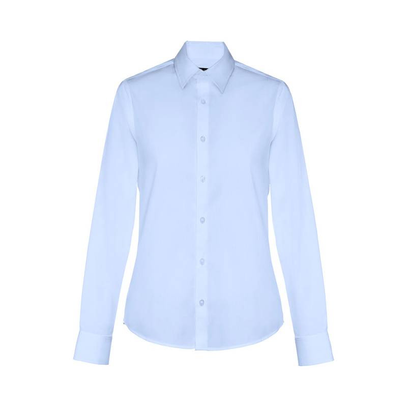 Women’s poplin shirt in 68% cotton, 28% polyamide and 4% elastane (115 g/m²). Long sleeve. Fitted cut. Placket with 7 coloured buttons. Adjustable cuffs with 2 buttons. 2 pleats on the back. Sizes: S, M, L, XL, XXL