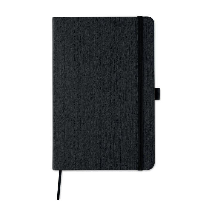 A5 notebook in wooden pattern effect soft PU cover. 80 lined pages including pen loop and closed by an elastic band.