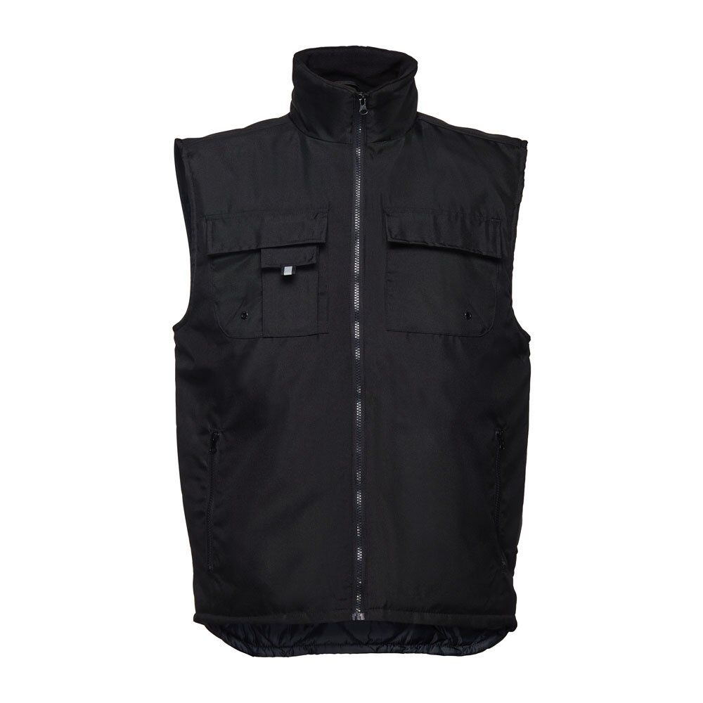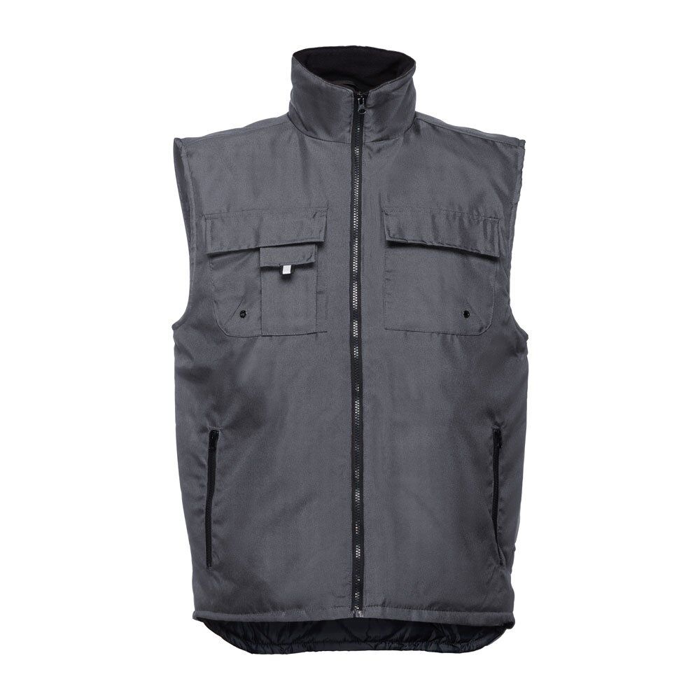 Padded work vest with 100% polyester lining and collar lined with polar mesh. 6 pockets: 5 front, including 2 with zippers inserted and 1 for mobile phone. 1 inside pocket. Side elastic for better fit to the body. Zipped lower back access for easy customisation. Sizes: S, M, L, XL, XXL, 3XL